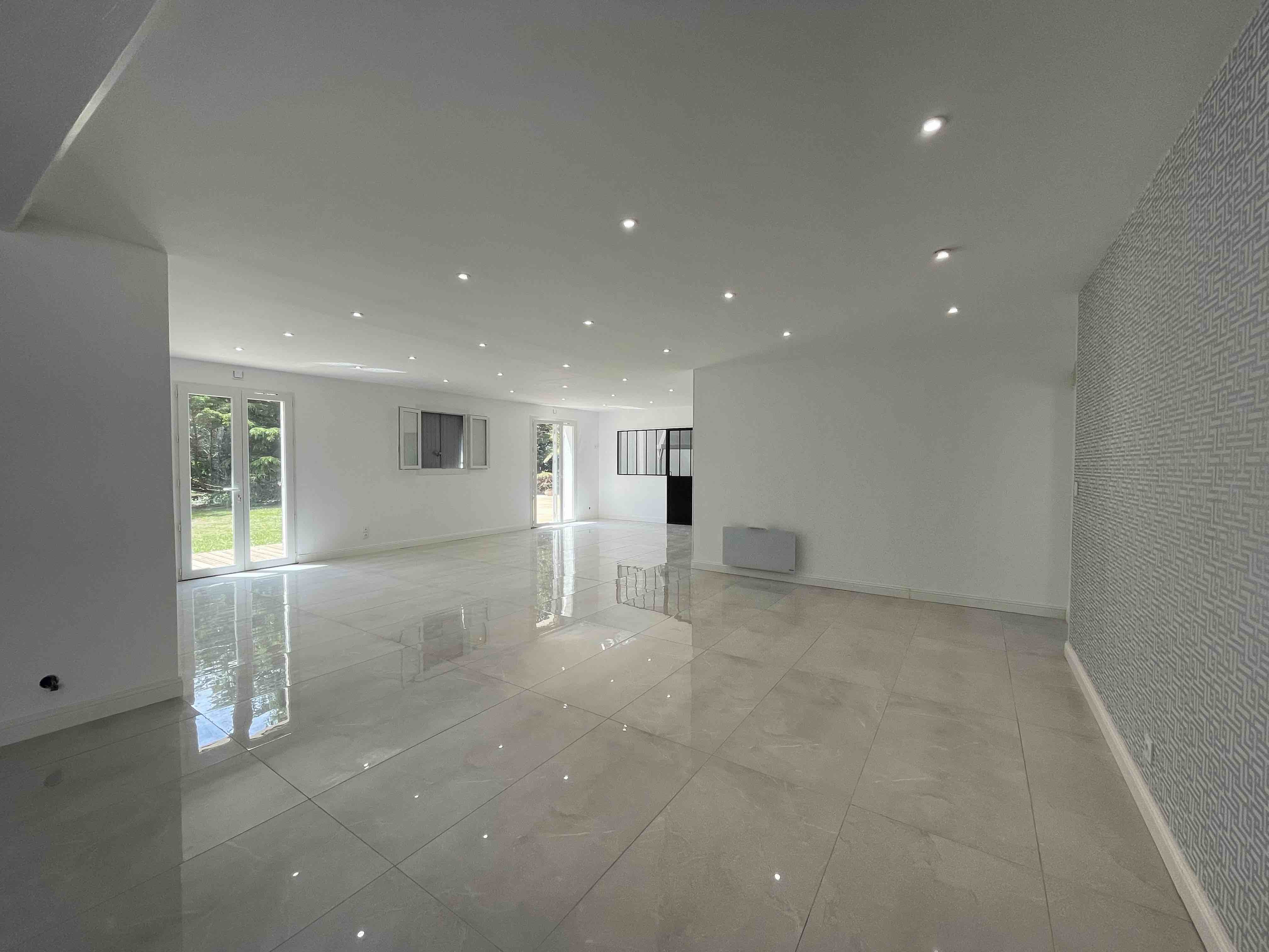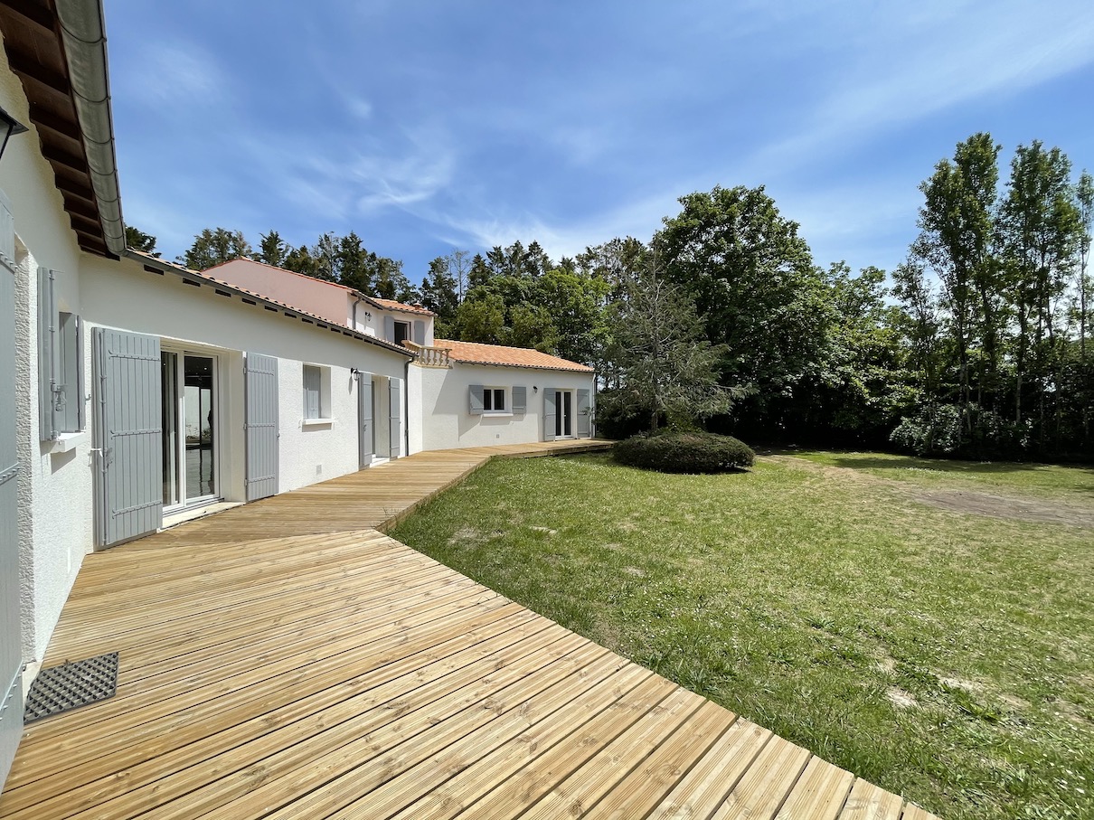 Belle et grande maison contemporaine de plain pied bâtie sur un vaste terrain arboré de plus de 3000m2, au calme de la campagne et à proximité de la ville. Elle se compose de deux logements communicants et totalise 5 chambres et 3 salles d'eau. La maison s’accompagne également de deux grand garages, qui peuvent abriter des véhicules, ou bien servir d’atelier aux bricoleurs.